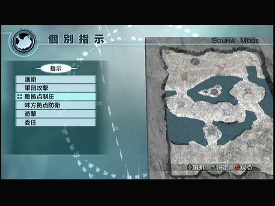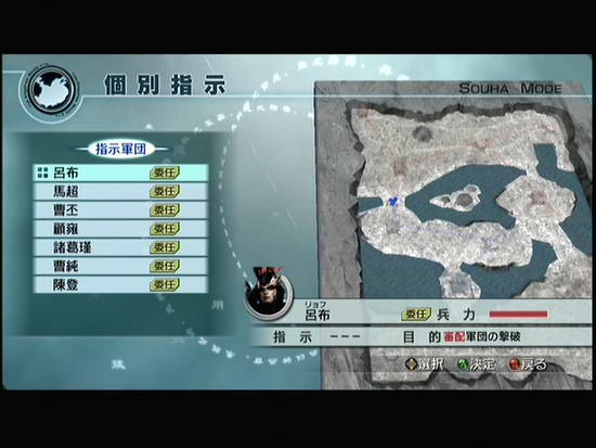 玩者可在战斗中命令各武将进行各种行动,于start后进入个别指示就可以对我方武将进行命令,分别为:护卫、军团攻击、敌据点制压、本方据点防御、游击、委任