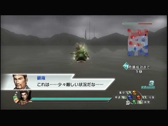 在我方阵地内也就是蓝色区域里同时按下L2+R2(LT+RT)即可发动奇袭,在限制时间内进入敌阵地即可奇袭成功(最前线的敌阵地不行)奇袭成功后敌据点耐久度减少,而且敌人兵士们的体力也是半死状态(发动奇袭时如果跳入水中进行移动就不会减少奇袭时间)当敌人进行奇袭时战场信息上会提示玩家注意敌人动向(敌人一般是先瞄淮兵粮库进行奇袭)每场战斗只能发动一次奇袭,敌我相同