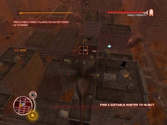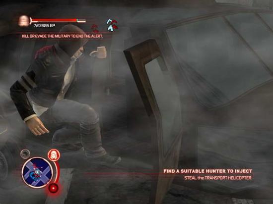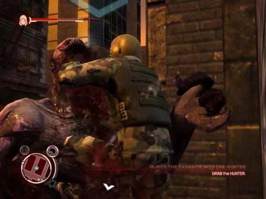 当里面的变异体出来后,就可以下飞机了(按住E),然后追它到天涯海角……(右上角为与变异体的距离,越满就越近)等它不跑了,凑过去一顿暴揍,但对方没血时,按E给打针于是对方再次逃走,于是又要追,于是最后吃掉对方