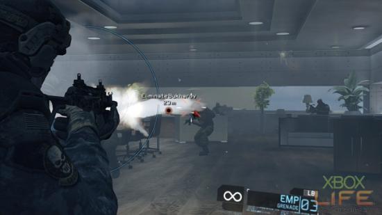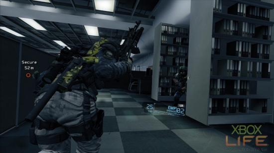 成功挺进办公室之后,玩家会再遭到二挺机枪的扫射,以及数名盾牌兵与人狼小队成员的攻击,如果有看到隐形人在办公室跑来跑去时,就立即朝著他们丢EMP手榴弹,并用榴弹炸死他们。