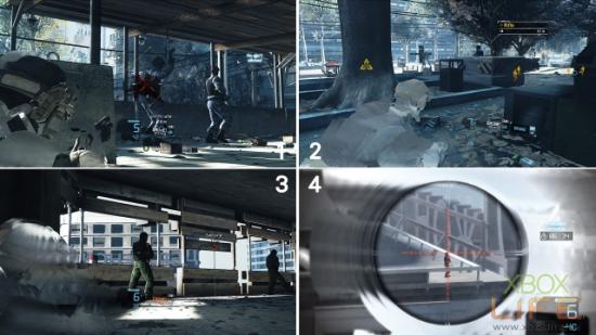 走进建筑物的大厅触发一段剧情动画后,顺著楼梯往上爬到顶楼会再看到2名狙击手(图示三),此时趴下瞄准增加稳定度处理掉他们。如没意外的话,剩下来的9名士兵就靠狙杀建筑物裡的敌人即可。