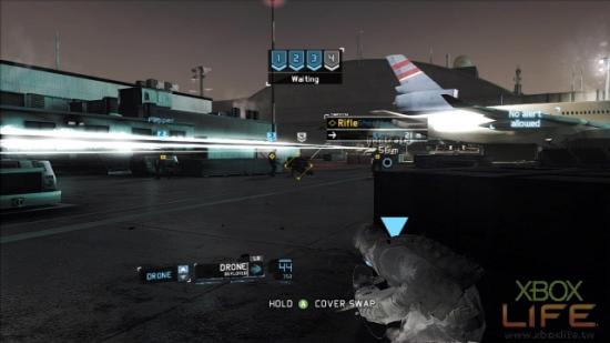 如果要解武器挑战任务的玩家,来到机场后就可以把你的衝锋枪拿出来用了,但如果想要连战术挑战任务A一起解掉的话,要特别注意自己的用弹量。若射击技术比较差一点的玩家,衝锋枪建议用P90,因为它一个弹匣可以装到50发,平均一名敌人可以喂5发子弹,算是非常充裕的子弹用量。当玩家来到飞机跑道的另一边时,先手动射击左上方顶楼的敌人。