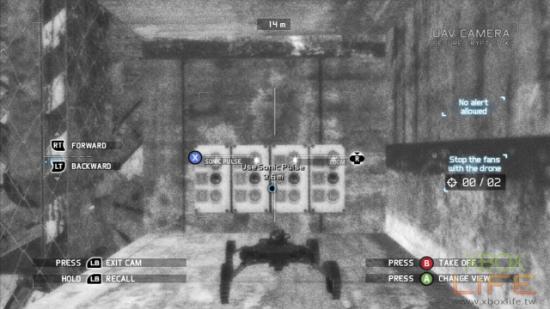 当队伍被通风扇挡住的地方,放出UAV并降落在二侧控制器的前方,按下X键破坏掉它们即可令风扇停下来了。