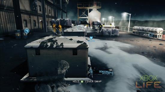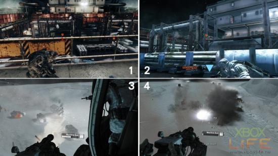 随著剧情来到甲板区,图示中的位置即是解武器挑战任务的最佳地点。首先丢一颗Sensor让敌人的位置显示出来,依序从右到左一个个爆头点名。