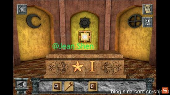 进门,在棺材上拿到榔头一把,并且可以看到棺木上有一个星星和罗马数字1,还有墙上的太阳方格。根据墙上的提示,知道我们还缺一个月亮,那肯定是在门1里面啦。