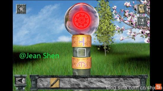 接着可以打开门,进到一个花园,将地上三个柱子按如下调整,