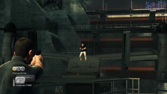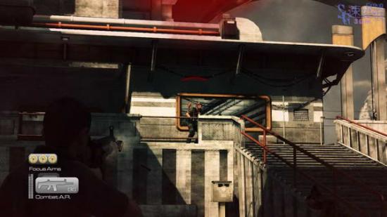 上边的敌人不用管,敌人飞机会帮我们干掉他,然后在使用控制台放水,还是打不到敌人飞机,然后从左边的断口跳过去在使用控制台,依然没有打到,然后干掉这里扶手后边两个敌人后上楼。