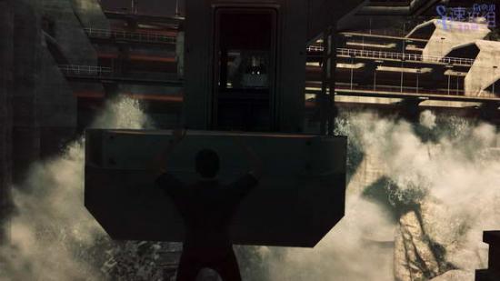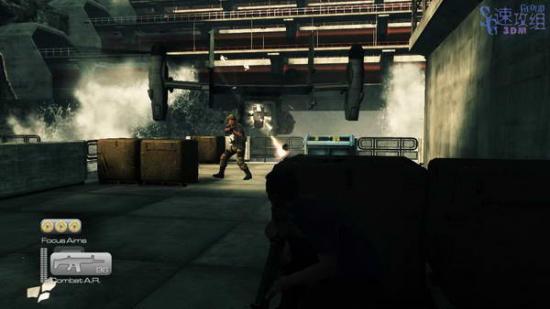 接下来来到一个类似一开始的场景的地方,杀光敌人后从右边走可以看到敌人的飞机飞过来,然后立刻上电梯。