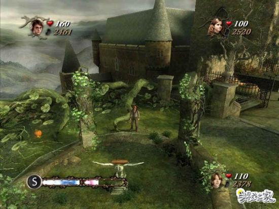 3.再次进入后向左走将铁门拉开,这里注意最好先用石头将前方地面上的小洞口封住,否则的话会有很多蜜蜂冲出来。继续往前走会发现有石块挡住了通道,使用魔法拉开石块后进入,就可以发现小水池的最里面有1个大型巫师盾。因为在使用植物快速生长魔法让花蕾开花的时候会有很多蜜蜂冲出来,所以建议先打开会吸引蜜蜂的花蕾,然后集中精神对付真正“蜂拥而至”的蜜蜂,最后在通过植物快速生长魔法开辟道路,获得大型巫师盾。