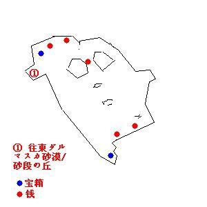 砂段の丘一共有4种敌人~其中タイニーサポテン和ワイルドザウルス是不会主动攻击的~~所以当HP不多的时候可以不去惹仙人掌~~恐龙就更不要惹了~一击必杀= =~~还好他不主动攻击~~辨别敌人是否主动攻击可以通过其HP的颜色~~非主动攻击的怪物的HP为绿色~而主动攻击的怪物HP为红色~要注意在探索过程中最好一点点前进~如果一次性引来太多的怪物的话会比较麻烦~~初期只有主角一个人而且能力也不是很强~所以战斗还是有一定难度的说~HP不多的时候别忘了及时使用ポーション进行回复~~