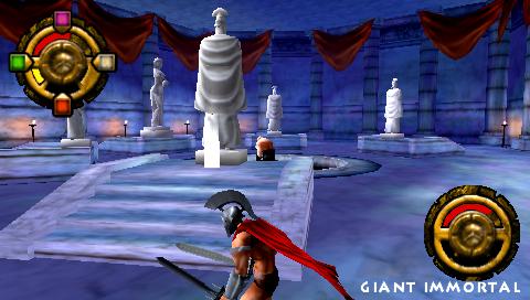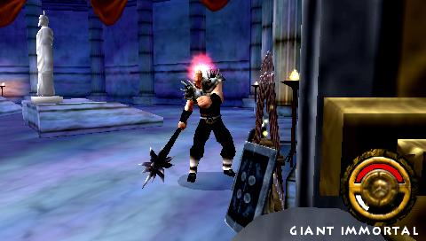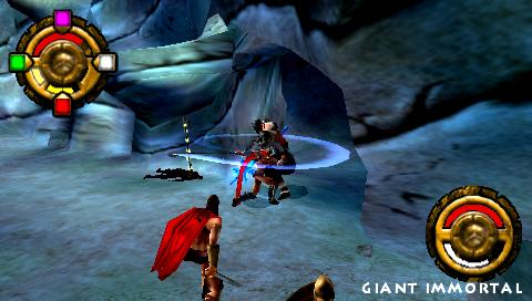 还是身着着那身讨厌的铠甲,用枪将其铠甲的耐久度打掉三分之一的时候他开始蛮撞一阵,不要站在离场景中心的位置,被他撞下去那可不好玩,尽量将他往墙边引,让他撞墙。又打掉他铠甲三分之一耐久度时,GIANTIMMORTAL又要蛮撞一阵(汗~~-_-!)。完全打掉铠甲后他的锤子会变蓝,砸地会掉下碎石,按L+R防御,他会不时跑去加血,此时赶快冲过去将石像推下来砸他,可以消耗他不少体力。战斗胜利后GIANTIMMORTAL掉下中心的圆坑......