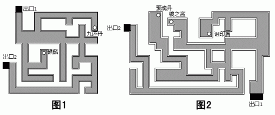出来后去左边2个帐篷,它们是联通的,里面有“偃月刀”,右上方的帐篷,有个出口处进去后是黑暗的迷宫,比较难走。见附图,第一个黑迷宫有一个罐子有宝马“麒麟”(防止异常),在两个迷宫之间有个过渡空间,上面有个八卦符,可以回复hp和mp,效果如同住客店。