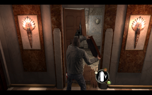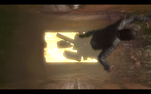 sh*t 我的裤子进入房间后,在柜子里发现医药喷雾,按H进入疗伤模式(大师啊).疗伤完毕后之后房屋又会震动开始坍塌,主角在掉楼下坠的途中拉在一墙壁装饰物上逃过一劫.(慢动作很帅哦=w=)