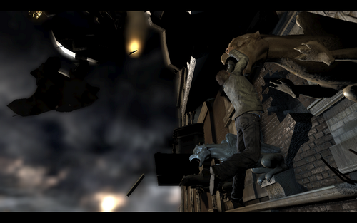 一个很华丽的片头后.爱德华落到了一个阳台下在阳台上爬绳子上去荡到左边墙沿上,左走墙沿塌陷(某NPC死的比较囧),回头上面再爬过去,这里也要注意上面的坠落物(中途小心炸上来的车,另外这个车炸的很NB),荡绳子去到对面的落脚点后,爬上墙上的裂缝,趁墙壁米有完全倒塌前跳下进入房间.这里要使用个很弱智的物理技巧。
