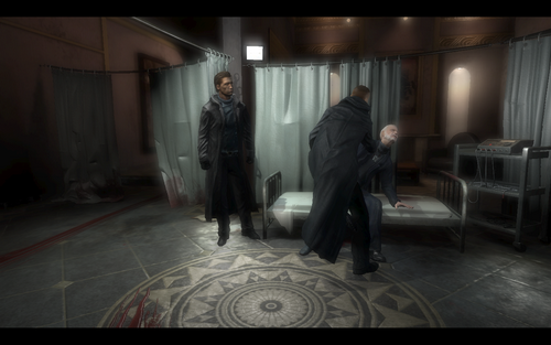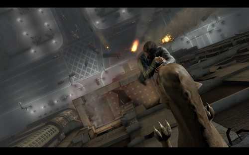 随后,就可以在第一/第三人称视角互换了.上了电梯上层进入剧情,貌似一切的起源都和老者身上的石头有关,在对话中主角也感到老者也是一个很重要的NPC..(为什么是NPC),对话到一半,灵异的事情发生了,那条裂缝又出来了,吞噬了路人甲后 向着那个貌似也很重要的NPC袭来.老者让男主角自己离开,么法"抛弃"了老者,爱德华自己逃生了.继续一路爬上梯子后,降下消防水管后(遇到风扇的地方使用空格