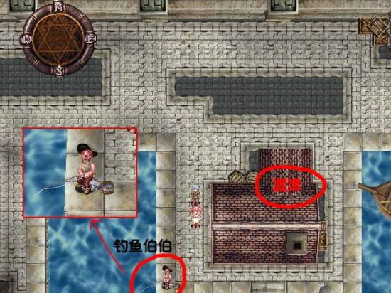 事件:和他对话几次,得知钓鱼伯伯没有鱼饵了,所以给30G拜托一行人去道具店买鱼饵(20G)