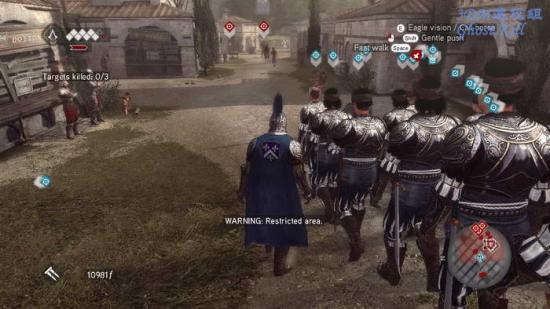 杀掉20个敌人后回到Bartolomeo那里,换装完毕后跟着大部队走, 路上会遇到几个真货,暗杀掉他们,然后到敌人的城前。