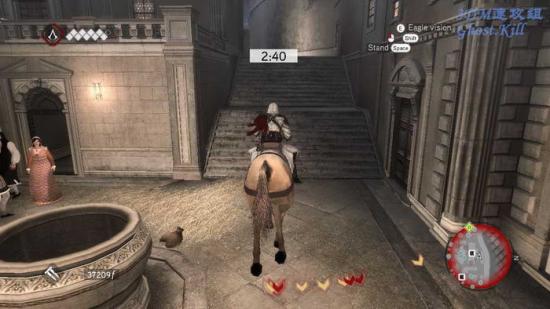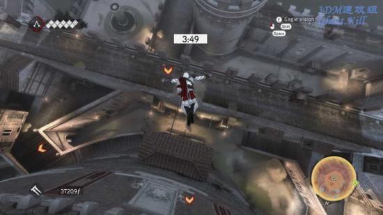 到上层后向下看,Cesare从下边的城墙上跑过,立刻跳下去追他, 时间紧迫,路上的敌人不要管,快到城墙尽头时跳到下边的河里。