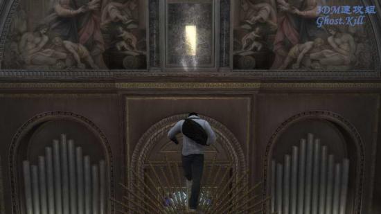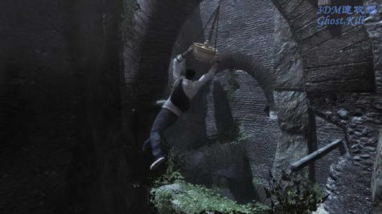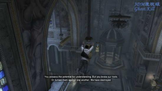 进入暗门后头上的地面会打开,爬上去后来到一个教堂,给同伴打开门, 到教堂前面的十字架上,然后跳到机关处,开启机关后教堂的天花板上降下来一个平台。