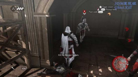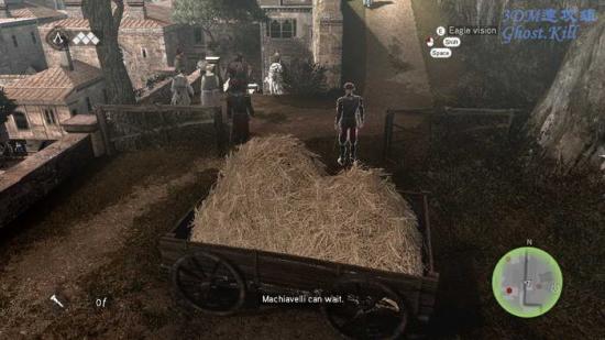 到敌人区域附近后让Machiavelli在马厩旁边等着,然后进入敌人的区域, 干掉头上有红十字盾牌符号的敌人,然后回到Machiavelli身边。