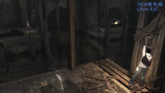 怕上面的柱子后跳到两边的平台,使用两个操作杆把房间中央的池子注满水, 水满了后一根柱子会倒塌,把中间的水池砸开,从砸开的大洞跳下去。