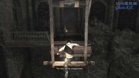 到下层之后可以看到目标的门前不能直接过去,要从旁边可以进入的房间绕道, 利用墙上凸起的砖块爬过去,然后打开这扇大门。