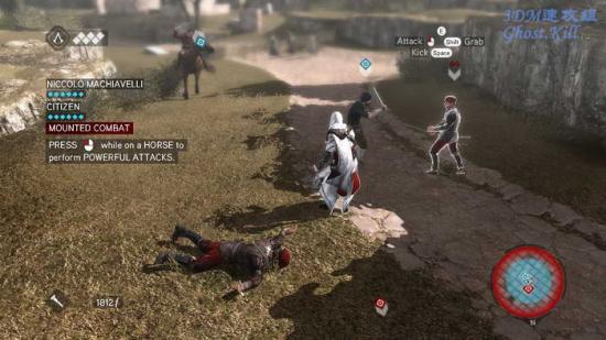搞定小偷之后再去找Machiavelli,继续骑马跟着他,遇到自己人被敌兵包围时过去把敌人杀光, 杂兵杀光之后还有个逃走的,像抓小偷时一样抓住他就可以完成任务。