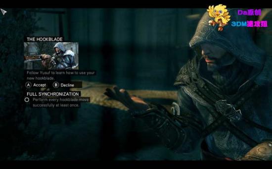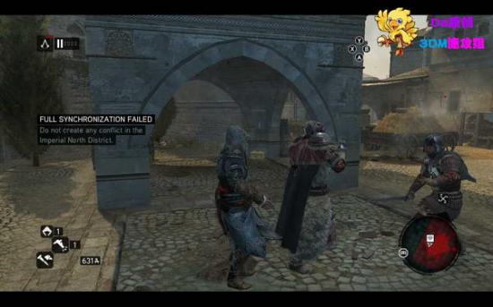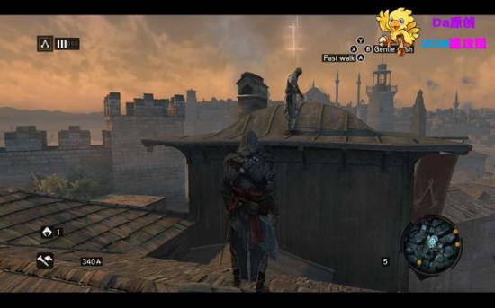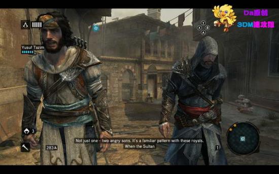 去到码头(小地图叹号)找到TAZIM,把三个守卫放倒,可以用到这代的新元素,烟幕弹!使用方法和火枪,袖箭一样!