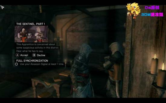 去城堡里找到苏莱曼,帮助他偷听会议对话。接受任务之后!往后走,爬上屋顶,去到对面塔上的暗门。进去就会完成任务
