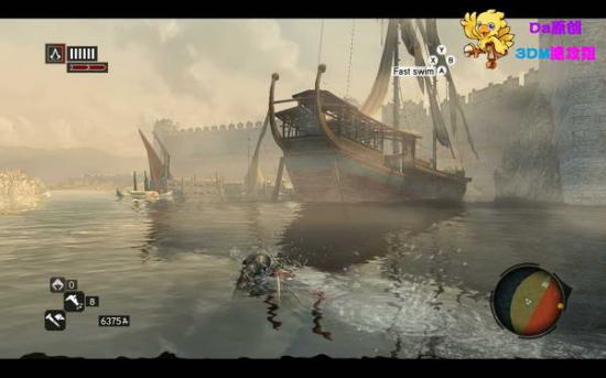 上船暗杀掉两个守卫,用鹰眼扫描几个货物,拿到需要的货物(船头位置)就下水游出小地图橘色范围