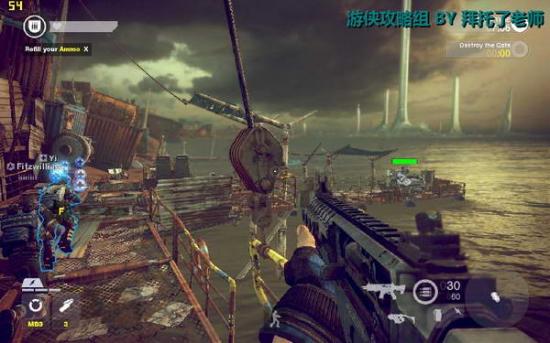 看到没?唯一有生命条的东西:这个东西就是你这一局的关键,你要先跑到这边来启动它,然后它就会跑起来。不管它到哪,你就跟到哪。记得还可以利用它做掩护。