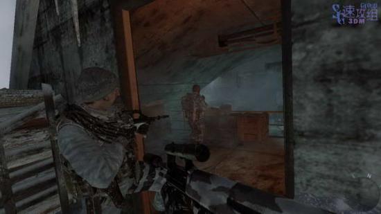 右边有三个敌人,先干掉二楼的放哨的,然后干掉外边巡逻的,最后干掉里边背对我们的。