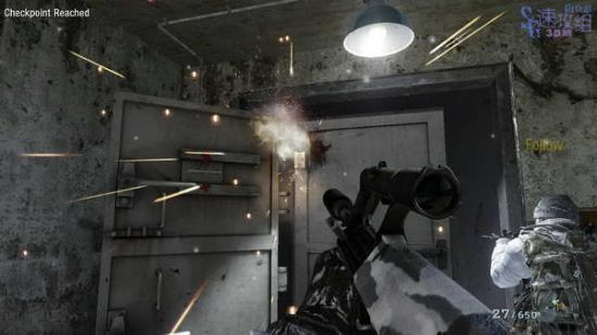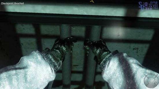 这里等全部敌人都离开后按W爬起来,前进几步后有个敌人和只狗从右边的门里出来,直接扫死继续前进。