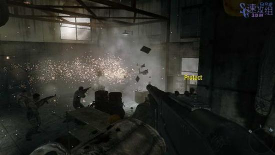回到刚刚的大厅,找个掩体好好守着,等Reznov开门,期间会不断地有敌人从楼下和墙的破口进来,多用霰弹枪和榴弹对付重甲敌人。