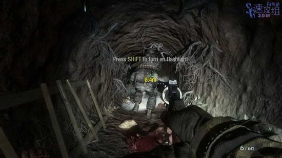 和reznov一起推开地道前德 障碍物后继续前进,前边突然杀出来的敌人被他解决掉后改成我们打头阵,左轮威力很大,前边只要出来敌人,瞄准开枪,一枪一个很稳的通过,尽头处按住F踢开障碍物从地道出去。