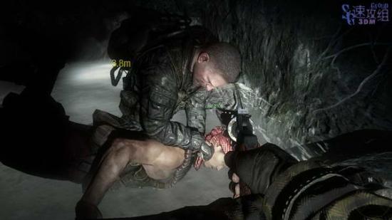 这个房间里开门出去后地道开始崩塌,向外跑的时候路被堵住,按近战键搬开石块出去,等woods的直升机来接我们后过关。