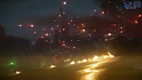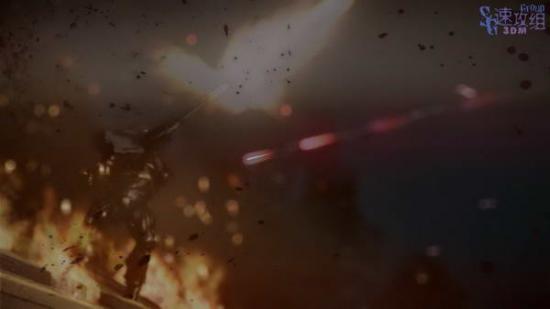 浮出水面之后可以看到漫天的火光,效果很华丽,紧接着突然被什么袭击了,抬头后看到一艘外星飞船,一阵扫射过后周围的大树全灭,主角也奄奄一息。