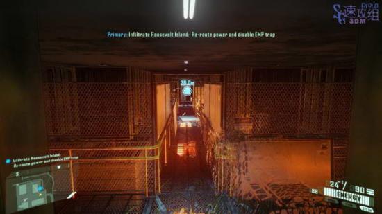 坐电梯到敌人基地的下层,这个房间滑步通过这里,不然会被电死,不要指望纳米服,能量会被吸光。