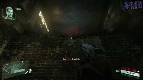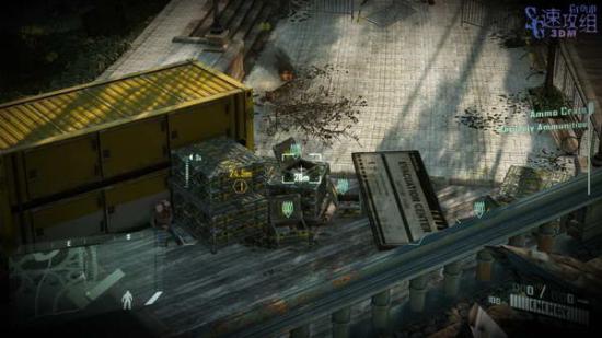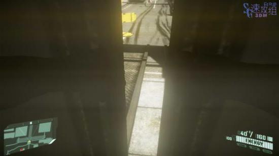 来到室外之后按B切换视觉模式,可以看到两个敌人和弹药补给,跳下去先补充弹药,然后干掉两个敌人,捡他们的枪,然后进入目标建筑。