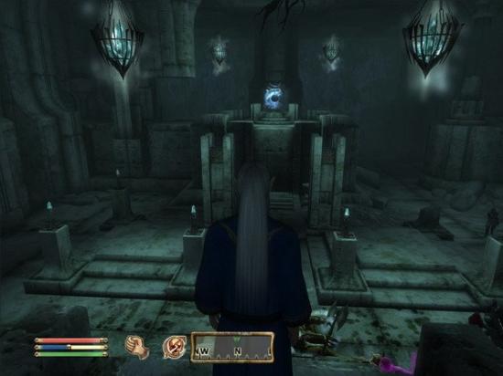 走到如图所示的地方,前面的通路被结界所挡住了,而且怪物永远打不死,必须破坏了那个蓝球才能解除结界.