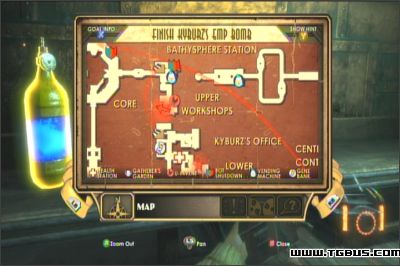 沿路一直走到目标地点按下开关,搜索挂着的一个发光的女人,消灭冲进来的敌人进入炸开的通路,这关首次出现的拿机枪的敌人比较厉害,防御也很高,推荐用电定住后直接射其头部,可一击必杀。沿路走到目标地点,中途有武器升级机,到目标地点后拿到录音,继续到下个地点拿到录音后会接到新任务,要求找到炸弹的零件,其中有四个在Big Daddy身上,另外有两个类似氧气瓶的东西的见如图