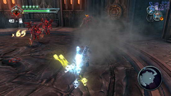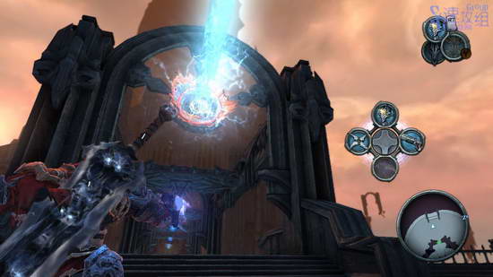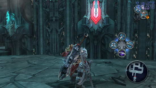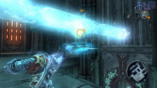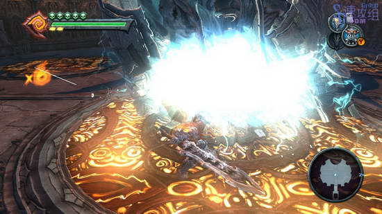 这里的大厅会遭遇大量敌人的高级兵,打不过的时候就用技能和变身,不要逞强,带着血就吃。所有敌人杀光之后会出现武器的石头,打破石头得到新武器,传送器,玩过传送门的话应该对这个武器很了解。