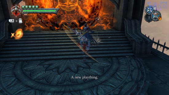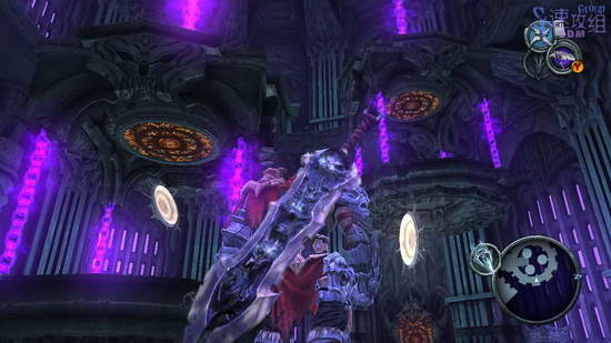 等这个BOSS像图中这样站在墙边的时候说明可以攻击,在理他不算远的地方按RT用锁链抓住他,让自己飞到他脸前砍他,砍了几刀之后他会开始瞬移,瞬移到我们头上头要冲刺躲开他的下压,不过这时间必须把握的很好才行,太早或太晚他都会跟着我们的位置压下来。我们也可以使用技能躲开,用技能的时候是无敌的,也可以变身躲开,不过感觉这样太浪费了。过段时间他又会回到墙边上,再用锁链飞过去砍他脸,几次之后他会瞬移用爪子攻击我们,比一开始的下压好躲,不过这样攻击时间长了点,接下来就是重复一开始的步骤了。