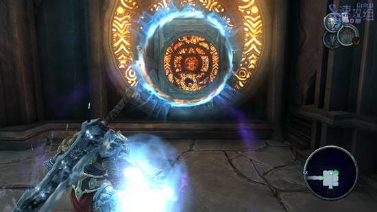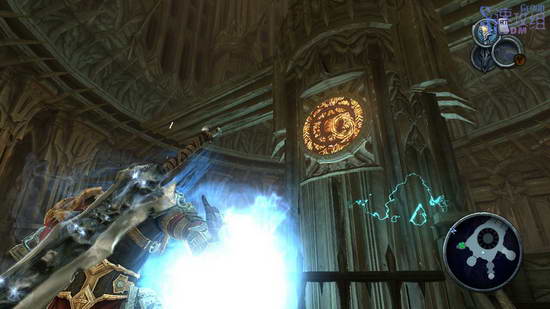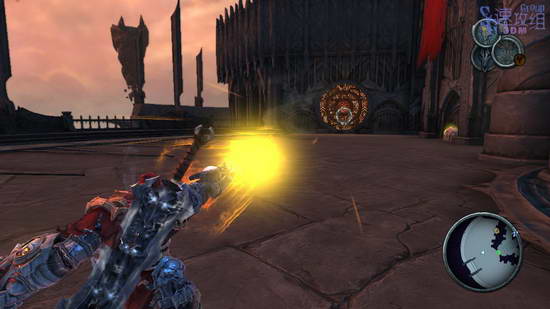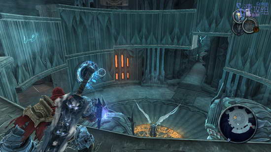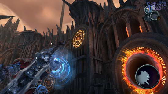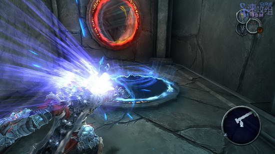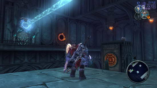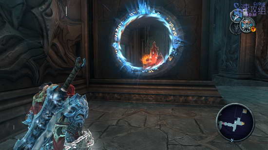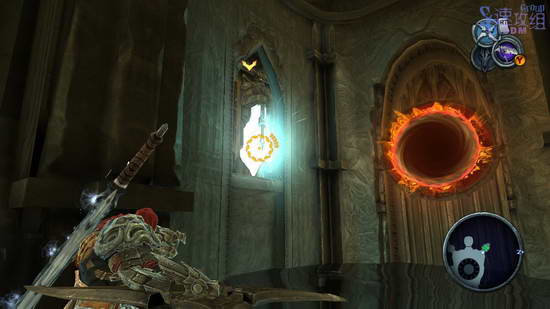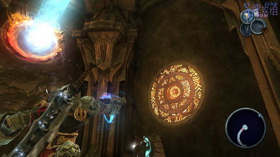 外边的机关以前也遇到过,现在右边的墙上开个洞,再在旋转石柱上开个洞,然后通过墙上的洞在对面的旋转石柱开洞后可以看到有红墙挡路,用锁链转过来火球搞定红墙然后跳过去,干掉所有敌人后进门。