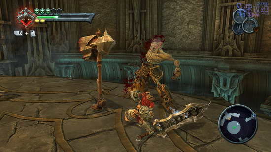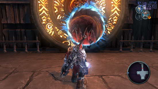 第一关的大BOSS,利用传送点,在地上和他锤子上开洞,等他把锤子抬到脑后时进传送门跳到他身后的弱点出按B,把剑插到他身体里,然后他会倒下,这时候砍他脸就行了,他起来之后会用锤子砸地和扫地,然后召唤出小兵和我们大,接下来还是重复一开始的动作就行了,干掉他之后天使带我们离开这里。