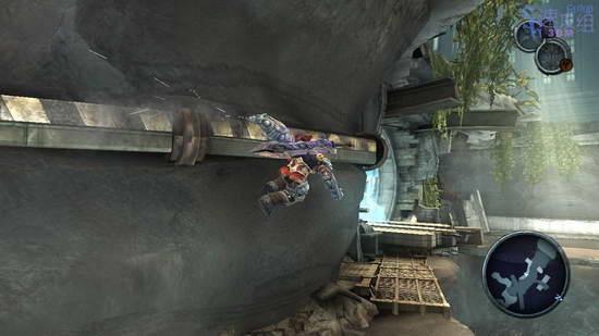 来到另一片沙地,右边有时间控制装置,不过被挡住了,从右边的网子爬到二层,使用机器,打开挡住时间控制器的门,回到沙地边缘处,减慢时间跑到另一边。到了另一边后一直都是一条路,路上不断有杂兵出来碍事,到了尽头处可以看到有杂兵在木质平台上利用绳索划过来,跳到那个平台上,从外侧上到二层使用机器,回到一层,减慢时间,爬上旁边的网子,爬到另一边下来。