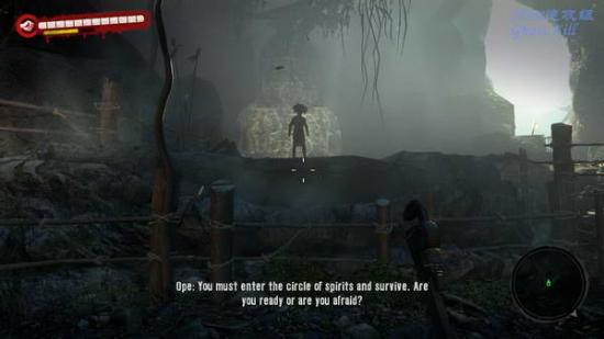 来到一个像是原始部落的地方,正门他们不让进,从左边绕到内部的竞技场, 这里会从两边的木门向外放僵尸。