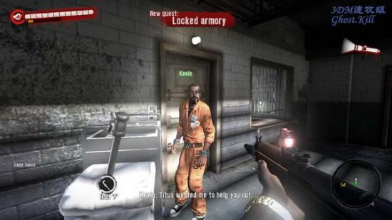 回到titus的房间后想起交差,这次他又要求去给他找武器,向指定地点前进,路上会遇到拿枪的敌人, 杀光之后撞开一扇门,见到武器库门边的kevin。