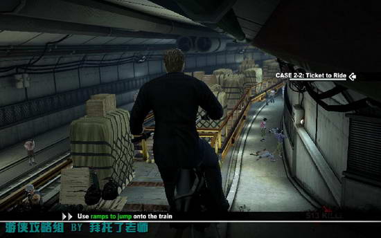 TK做火车离开,主角骑上抢来的摩托车追赶。保持距离,不要被甩掉了,还要小心从火车上扔下来的东西。提高速度,按空格键借助斜坡飞跃到火车上。