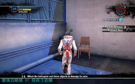 在屋顶遇到TK的直升机,Chuck用机器吊住了直升机。我们需要扔东西把直升机砸下来,打枪是没用的,枪可以留着去对付公园里面那些楼上的歹徒。直升机不仅会降低高度来冲撞,上面还有机枪扫射。可以用翻滚跳跃等躲避射击和冲撞。
